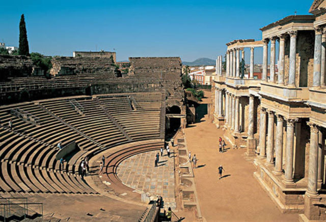 Destacamos de la Emerita Augusta: el Teatro romano, el Anfiteatro romano, el Circo romano, el Puente romano sobre el Guadiana, el Acueducto de Los Milagros, el Templo de Diana y Los Columbarios entre otros. -