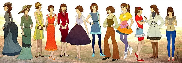 Fashion in this age represents the fun and freedom that existed after the war. Loose dresses, low heels, hats and fringes predominate. The corset is discontinued and the hem reaches above the ankle.