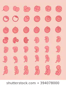The egg is released from the ovum, and is fertilized by the sperm in the fallopian tube. The fertilized egg then attaches to uterine wall. Next, the egg begins to grow by cell division. The internal organs and circulatory systems are forming. By the end of this month the heart beat begins. Bumps show the beginning stages of limb growth. The zygote is only the size of a pinhead by the end of this month, and is nearly a tenth on an inch long.