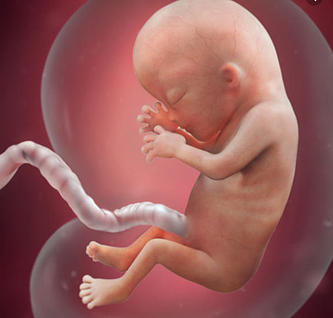 This is the beginning of the fourth month of pregnancy. The baby's arms and legs can now start to flex.