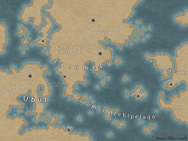 The tarago of the Fleumos Archipelago lived in small villages in the mountainous islands, though Fleo Crana grew to a size large enough to consider it a city-state.