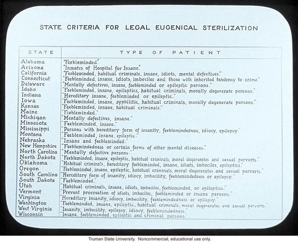 "Sterilizations legally began in 1913 and ended in 1961 (Paul, p. 627). There were a few cases of sterilization before it was legalized, however. The superintedent of the Kansas State Home for the Feebleminded at Winfield, Dr. F. Hoyt Pilcher, performed 58 castrations, and even as many as 150 sterilizations in total. This process began in 1894 and ended several years later when Pilcher was removed from his administrative position."