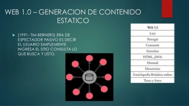 generaciones de la web By evelin19 Feb 15, 1991 Web 1.0 La Web 1.0 empezó en los años 60’s, Jun 13, 2004 Web 2 se celebró en Octubre de 2004 Dec 6, 2006 web 3 Web 3.0 es un neologismo que se utiliza para describir la evolución del uso