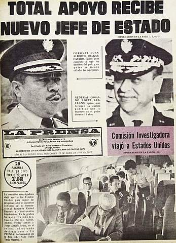 Después de un escándalo relacionado con el pago de un soborno por parte de una empresa estadounidense. Oswaldo López es depuesto por un nuevo gobierno militar encabezado por General Juan Alberto Melgar Castro. -
