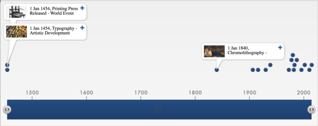 Chromolithography enters the world. Think of the "Printing Press for artwork" though it's a technique, not a device. Known as the "Democracy of Art" this process allowed the "common man" to witness and own great works of art for the first time at quality virtually indistinguishable from the original to the untrained eye (Gaffney, 2006). Chromolithography also allowed the first posters to be made, a great leap forward for Graphic Design (World Events, n.d.). *Day and month are approximate.