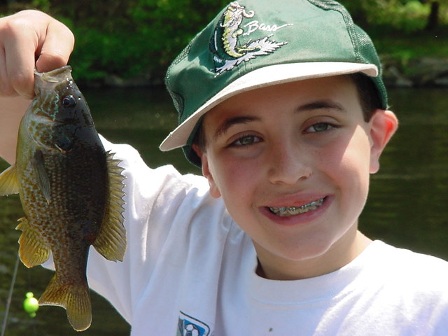 A sunfish out of Middle Bolton Lake in Bolton, Connecticut. The yellow ball in the background is a bobber and it is used when fishing bait.