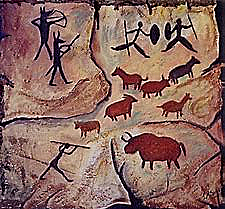 Inicia hace 35000 años atrás con las primeras pinturas rupestres. El hombre primitivo solía pintar figuras de animales o de personas cazando algún animal y con extraños atuendos, pues tenían una creencia de que la representación gráfica de la acción le daría suerte en la cacería.