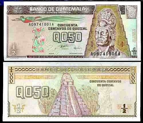 el Banco de Guatemala emite sus primeros billetes en denominaciones de 50 centavos, así como en 1, 5, 10, 20 y, por primera vez, 100 quetzales. También continúa con la acuñación de monedas en valores de 25, 10, 5 y 1 centavo.