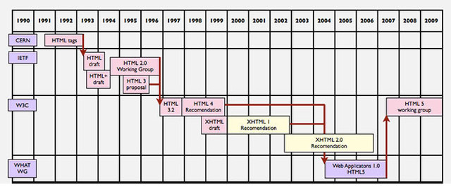 Desde la publicación de HTML 4.01, la actividad de estandarización de HTML se detuvo y el W3C se centró en el desarrollo del estándar XHTML. Por este motivo, las empresas Apple, Mozilla y Opera mostraron su preocupación por la falta de interés del W3C en HTML y decidieron organizarse en una nueva asociación llamada WHATWG (Web Hypertext Application Technology Working Group).