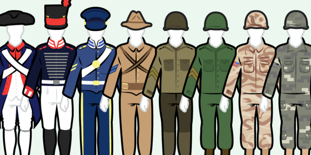 Army Uniforms can be rooted to the British army of the 18th century. The uniforms were smallclothes, tight fitted, and consisted of wool and linen. -