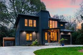 - Strong geometry and massing including large central chimneys with a brick or stucco exterior