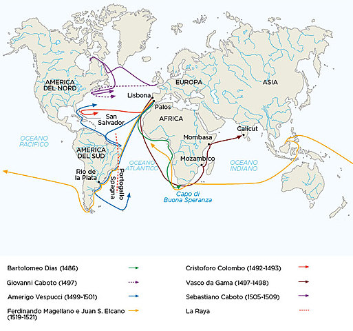 Ferdinando Magellano con cinque navi partì dalla Spagna e dopo alcuni scali di rifornimento raggiunse l'America meridionale e iniziò l'esplorazione della costa a sud del rio della Plata. L'anno successivo,entrò nell'oceano a cui dette il nome di Pacifico, per la tranquillità delle sue acque. Nel 1521 arrivò nelle Filippine,dove però Magellano venne ucciso e l'unica nave rimasta rientrò in Spagna nel 1522 sotto la guida di Juan Sebastiàn Elcano.