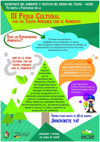 El Gobierno Departamental, a través de la Secretaria del Ambiente y Gestión del Riesgo, realizará esta Tercera Feria Cultural, con el objetivo de visibilizar, promover y divulgar los diferentes procesos amigables con el ambiente .