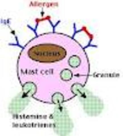 Allergen enters body, but the individual will not show outward symptoms. However, an IgE antibody is formed and attaches itself to cells found in the tissues in cells all over the body