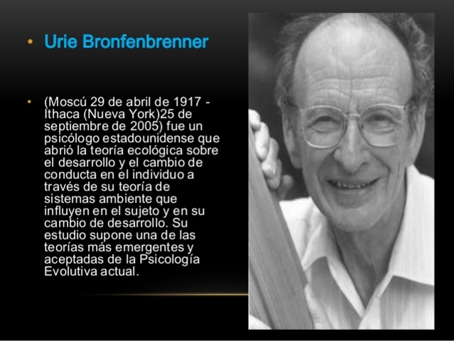 La Teoría Ecológica de Bronfenbrenner, define un sistema ambiental basado en el desarrollo de los individuos a través de los diferentes ambientes en los que se mueve y que influyen consecuentemente en sus cambios y desarrollo cognitivo, moral y relacional. Esta teoría, la publica, en el año 1979, en su libro más conocido: “La ecología del desarrollo humano”.