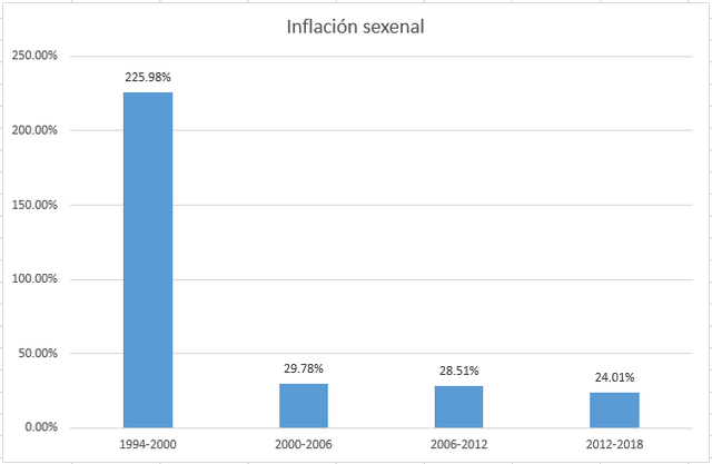 Inflación sexenal By Jennifer1993 Dec 1, 1994 Sexenio 1994-2000 Inflación: 225.98% Presidente: Ernesto Zedillo Dec 1, 2000 Sexenio 2000-2006 Inflación: 29.78% Presidente: Vicente Fox Dec 1, 2006 Sexenio 2006-2012 Inflación: 28.51% Presidente: Felipe Calderón Dec 1, 2012 Sexenio 2012-2018 Inflación: 24.01% Presidente: Enrique Peña Nieto