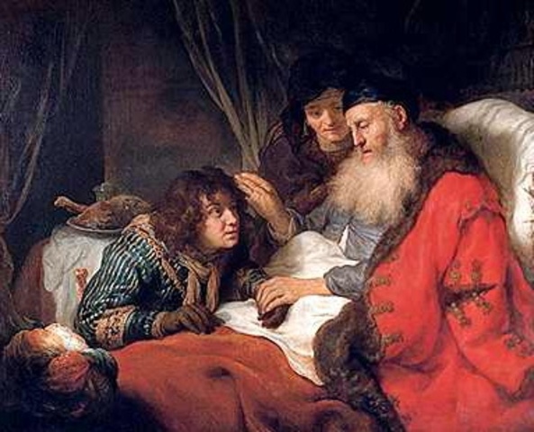 Quan Isaac es va fer vell i els seus ulls ja no podien veure, cridà a Esaú i li digué que anés a buscar alguna cosa de caça, i que li cuinés com a ell li agradava, i després li donaria la benedicció. Rebeca va sentir la conversa i va córrer a preparar-ho tot perquè la benedicció fos per en Jacob. D'aquesta manera, Jacob va substituir al seu germà i va rebre la benedicció del seu pare.