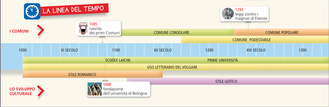 L’eta comunale By Michy06 Period: 1000 to 1340 Scuole laiche. La prima università Lo sviluppo culturale Period: 1000 to 1340 Uso letterario volgare Lo sviluppo culturale Period: 1000 to 1150 Stile romanico Lo sviluppo culturale 1085 Nascita dei primi comuni I comuni Period: 1085 to 1250 Comune consolare I comuni 1088 Fondazione dell’università di Bologna Lo sviluppo comunale Period: 1088 to 1340 Stile gotico Lo sviluppo culturale Period: 1180 to 1340 Comune podestabile I comuni Period: 1250 to 1340 Comune popolare I comuni 1293 Leggi contro i magnati di Firenze I comuni