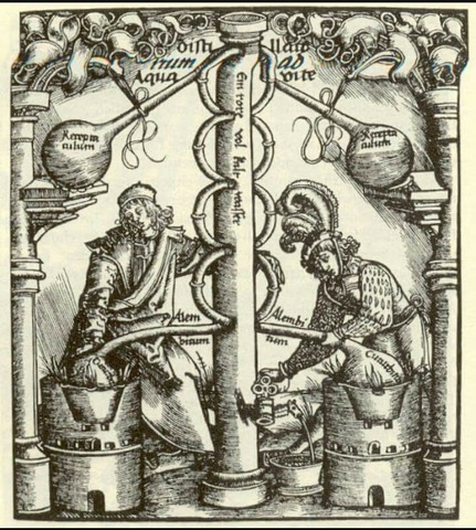 Es una pintura, grabada del artista Jan Van Der Straet que forma parte de su serie nova reperta, realizada en 1580. La destilación, repetida cuento o miles de veces, era la operación principal que desarrollaba el alquimista en su laboratorio.