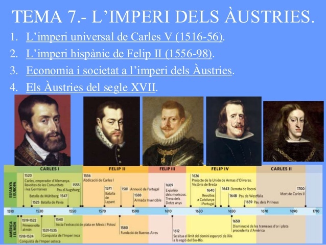 La dinastia dels Austries By ORIOLPEIRÓ Period: 1516 to 1556 Regnat de Carles I 1520 La revolta de les Comunitats 1525 Batalla de Pavia 1555 Pau d'Augsburg Period: 1556 to 1598 Regnat de Felip II 1557 Batalla de Saint - Quentin 1561 Madrid es transforma en la capital 1571 Batalla de Lepant Period: 1598 to 1621 Regnat de Felip III 1604 La Pau de Londres 1609 Expulsió dels moriscos 1615 Consolidació de la Pau de Vervins Period: 1621 to 1665 Regnat de Felip IV 1643 Derrota de Rocroi 1648 Pau de Westfalia 1652 Final de la Guerra dels Segadors Period: 1665 to 1700 Regnat de Carles II 1667 Inici de la guerra de la Devolució 1679 Creació de la Junta de Comerç 1700 Mort de Carles II