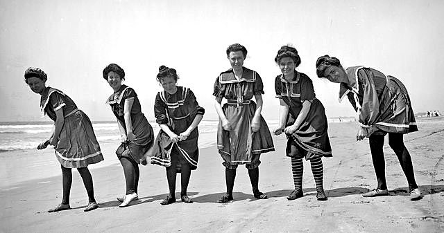 El traje de baño al principio en los 1900s eran mas como batas y vestidos, que un traje de baño. La mujer se tenía que cubrir de cabeza a pie porque corrían el riesgo de ser arrestadas si estaban vestidas inmodestamente. Los vestidos, o traje de baño, para meterse a la agua eran normalmente grandes con mucha tela y eran hechos de algodón en ves de un material como lycra, que se usa hoy en día.