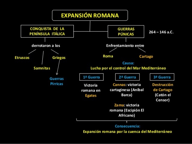 La conquista del sur de Italia por Roma amenazaba la hegemonía de Cartago en el Mediterráneo, desencadenando poco después las Guerras Púnicas (264-146 a.C.). La derrota de Cartago, favorecida por la victoria de Escipion sobre Aníbal , permitió a Roma ocupar todo el Mediterráneo central y Occidental incluyendo el sureste de Francia, norte de África, Sicilia, Córcega y España (133 a.C.).