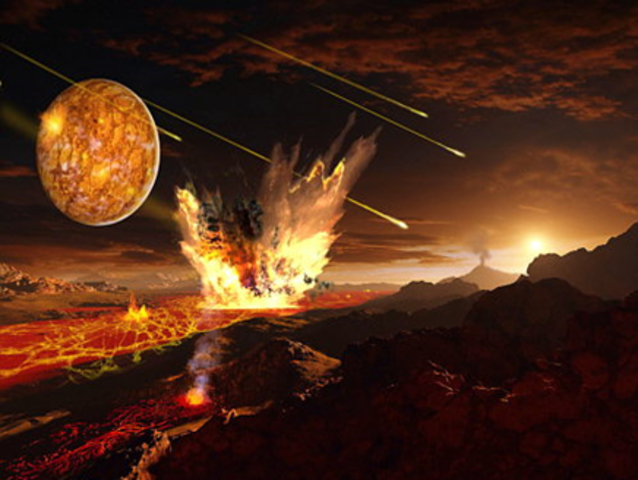 Se forma la luna cuando la tierra colisiona creando gran numero de satélites que se fusionaron para crear la luna