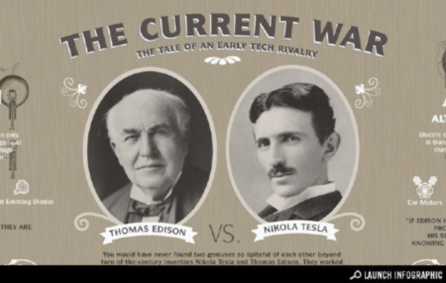 George Westinghouse, emprendedor estadounidense e ingeniero, apoyó económicamente al desarrollo de una sencilla red de corriente alterna basándose en las patentes de Nikola Tesla. Thomas Alva Edison, Inventor estadounidense y empresario, impulsó el desarrollo de una red de energía de corriente continua.