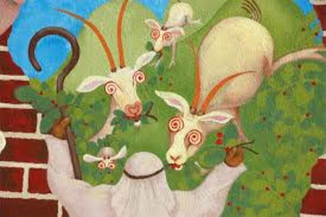 Tiene sucesos en las montañas de Abisinia y relata como un pastor llamado Kaldi, intrigado por el comportamiento alocado de su rebaño de cabras luego de consumir las hojas y los frutos de un arbusto, resolvió llevar ramas y cerezas a un monasterio, quien las cocino pero resulto de un sabor muy desagradable, y prefirió tirarlas al fuego en donde desprendió un suave aroma tan grato, que probo a preparar una infusión con los granos tostados y molidos de las que todos disfrutaron con placer.