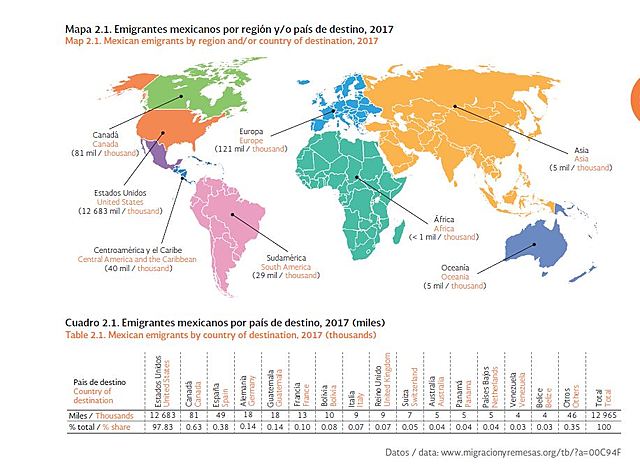 Al menos 1.1 millones de mexicanos mayores de cinco años vivían en otros países y al menos el 18% de la población radicaba en Estados Unidos. Las principales entidades de nacimientos de los migrantes son. Michoacán, Guanajuato, Ciudad de México, Jalisco y San Luis Potosí.