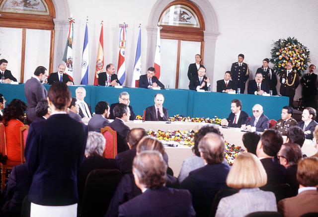 En el Castillo de Chapultepec, en la Coidad de México, los representantes del Gobierno y del FMLN, así como invitados de honor de los países garantes del proceso, firmaron los Acuerdos de Paz, con los que se puso fin a doce años de conflicto armado.