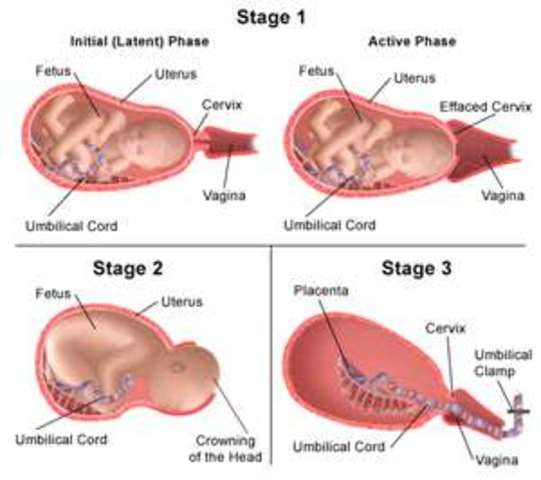 Crowning- the head appears at the opening of the birth canal. The contractions are more productive, pushing the baby throught the pelvis.