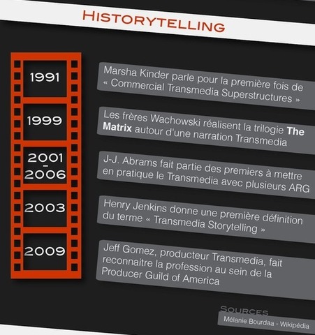 Le transmédia en quelques dates... By rineca17 Jan 1, 1991 1er mention 'Commercial Transmedia Superstructures' par Marsha Kinder sources Mélanie Bourdaa Period: Jan 1, 1991 to Dec 31, 1999 GENERATION Z : LES DIGITAL NATIVES Jan 20, 1999 Trilogie The Matrix 1er narration transmédia Mar 1, 2000 Eclatement de la bulle Internet Period: Jan 1, 2001 to Dec 31, 2006 JJ Abrams développe le transmedia dans les ARG Jan 1, 2003 Henry Jenkins définit le Transmedia Storytelling Sep 22, 2004 ARG Lost produite par JJ Abrams Oct 20, 2004 Avènement du web 2.0 Mar 21, 2006 Création de Twitter Sep 1, 2006 Lancement de FaceBook Jul 15, 2007 ARG The Dark Knight : 10M de joueurs Sep 1, 2008 Krach boursier, éclatement de la bulle des subprimes Jan 1, 2009 J. Gomez fait reconnaitre la profession de producteur transmedia Nov 1, 2012 Lancement de Assassin's creed III Nov 12, 2012 Lancement de Alt Minds Jan 22, 2013 1er SmartFip@