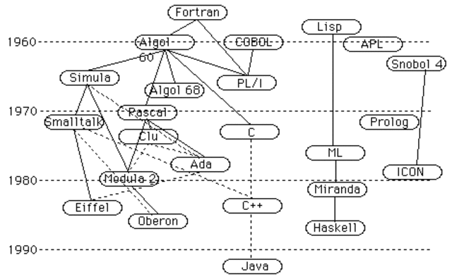 (En honor a Ada Lovelace): Es derivado del Pascal. Contratado por el Departamento de Defensa de los EE.UU. en 1977 para el desarrollo de sistemas de software grandes. Ada es un lenguaje de programación orientado a objetos y fuertemente tipado de forma estática que fue diseñado por Jean Ichbiah de CII Honeywell Bull por encargo del Departamento de Defensa de los Estados Unidos.