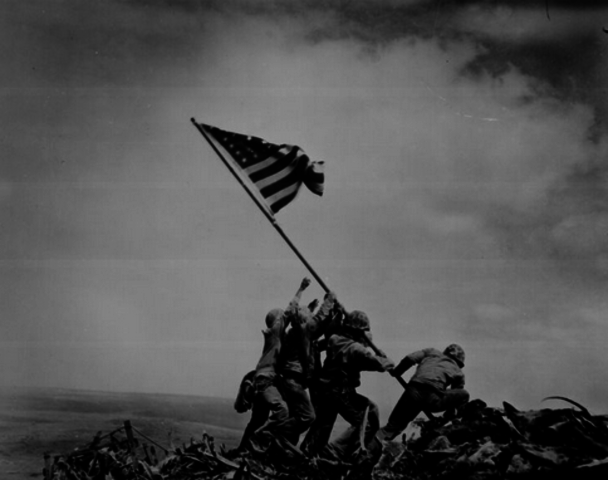 A group of Marines made it to the top of Mount Suribachi and raised the American flag as thousands of soldiers below watched and cheered. Two flags were raised on this day, the second flag was bigger.