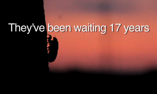 Fertilized female cicada deposits larvae eggs at the base of a tree. This begins the seventeen year gestation period.