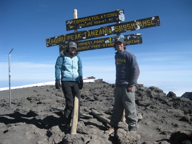 Here me brother and i are at the top of Mt. Kilimanjaro in Tanzania. This was a tough journey, it took us 4 1/2 days of hiking to reach the summit.
