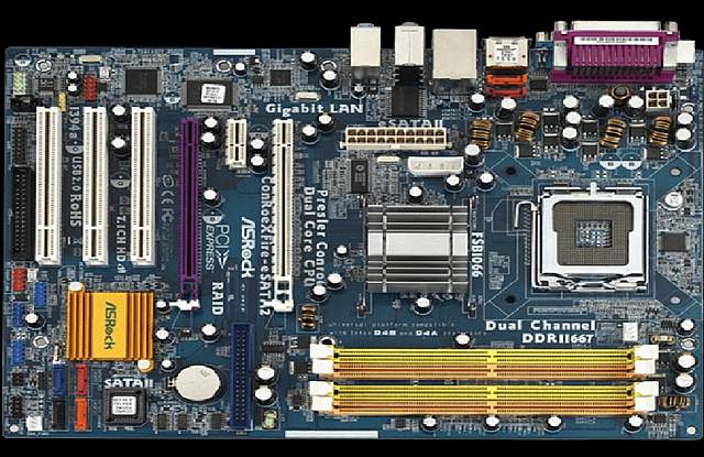 Microprocesador Intel 8088 de 16 bits y una zócalo para poder enchufar un coprocesador numérico Intel 8087, dos conectores DIN; cinco ranuras de expansión ISA de 8 bits para la inserción de tarjetas de expansión, cuatro bancos de memoria RAM donde se podía tener desde 16 KiB hasta 64 KiB, y posterior desde 64 KiB a 256 KiB (abajo a la derecha), una memoria ROM con el IBM ROM BIOS y cuatro para el IBM ROM BASIC más un zócalo para una ROM adicional, y chips de soporte y de pegamento.