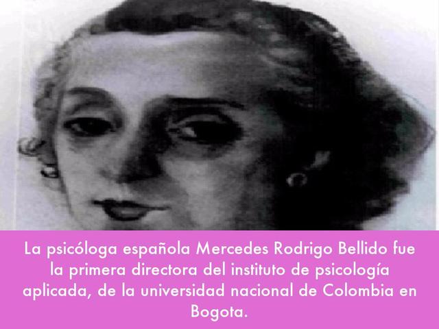 Llego en agosto de 1939 a la ciudad de Bogotá la Española Mercedes Rodrigo Bellido, en (1891-1982) comienza la profesión de Psicología en Colombia.