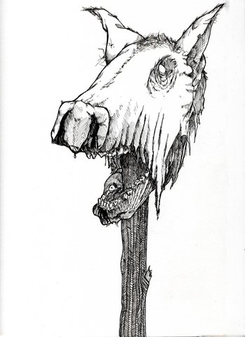 The hunters put a pig's head on a stake, as a gift to the dark lord.