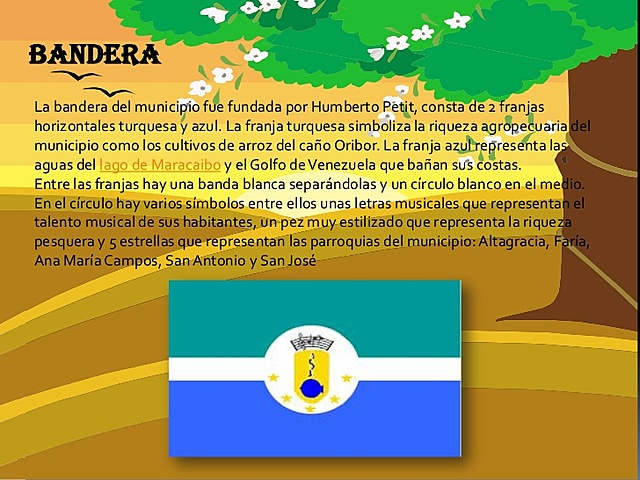 Creado por el dibujante, deportista y cantante mirandino Douglas Faría Matos. Lleva en su campo los colores amarillo, azul y rojo en sus tres cuarteles, en el azul está la heroína Ana María Campos, en el amarillo representa las riquezas naturales del municipio: la pesca, el ganado y el cultivo, y en el rojo figuran las instalaciones de la Petroquímica "El Tablazo", emblema del desarrollo industrial del municipio, en el superior se destaca un sol naciente vitalidad y clima de la región.
