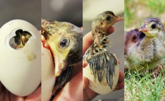 La gallina cacareará al oír píar a los polluelos para motivarles a salir del cascarón.Como no todos los huevos eclosionan al mismo tiempo la madre continua durante dos días incubando desde el nacimiento del primer polluelo, los cuales agotan los nutrientes de la yema que han absorbido antes de nacer.