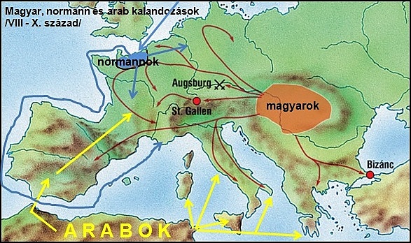 A kalandozások kora. A Kárpát-medencei magyarság az Európa nyugati részében ismeretlen sztyeppi lovasnomád harcmodort alkalmazva rabló hadjáratokat vezetett Európa több országába. A hadjáratoknak a 955-ös augsburgi vereség vetett véget.