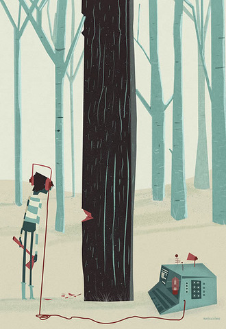 Con mucha excitación, En la mañana, Klausner se dirige al parque con una hacha y su caja negra.