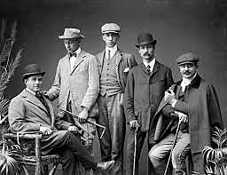 Stripes were in, and so were lounge suits. Suits were tailors, but the jackets kept long. Hats seemed to still me popular.