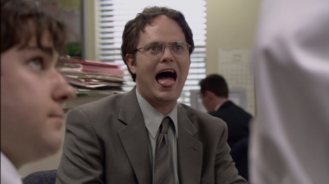 In this photo, and for the rest of the photos of Dwight, you'll see a pattern. Dwight is usually wearing something plain and relatively boring. The colors of his clothing are muted and everything he owns is basically the same. In this specific photo, he's wearing what looks like a sports jacket, a tie, and a long sleeve shirt. Each article of his clothing is a different shade of grey.