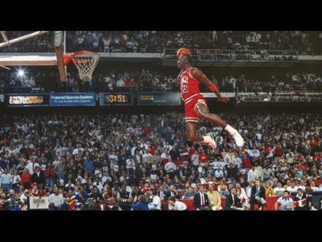 Jordan beats Dominque Wilkins in the dunk contest. He set a new record by jumping from the free throw line ('88).