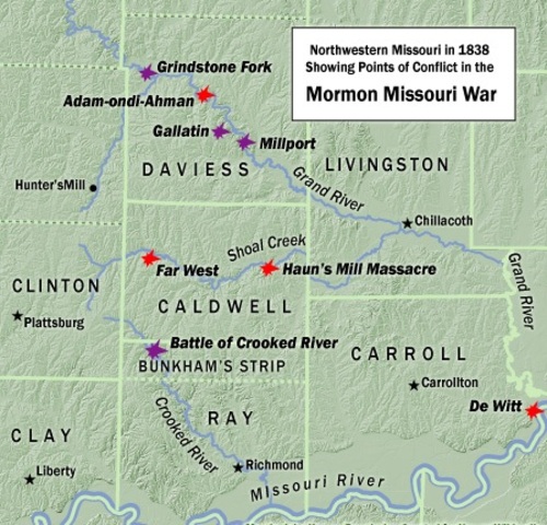 The Battle of Crooked River occurs in the Buncombe Strip, administered by Ray County, just south of Caldwell County. The Mormons knowingly or unknowingly exchange fire with official Missouri militia, a fateful step. Three in the Mormon party die from wounds received in the battle (including the Mormon leader, Apostle David Patten); one militia member on the opposite side dies. Exaggerated reports of this battle, combined with reports of previous Mormon military activities in Daviess County, caus