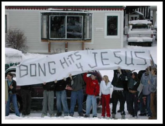 Joesph Fredrick, senior in Alaska unveils a banner that says Bong Hits for Jesus
