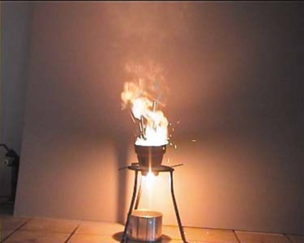 Kialakítunk a porban egy mélyedést, amelybe gyújtókeveréket szórunk. Ebbe beleszúrjuk a magnézium szalagot!